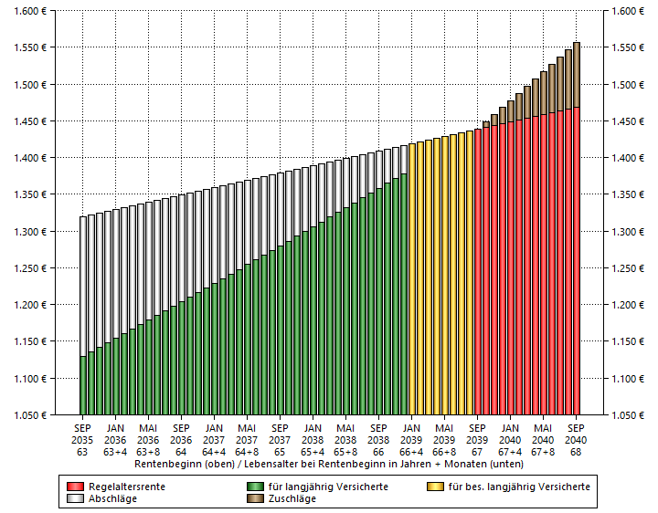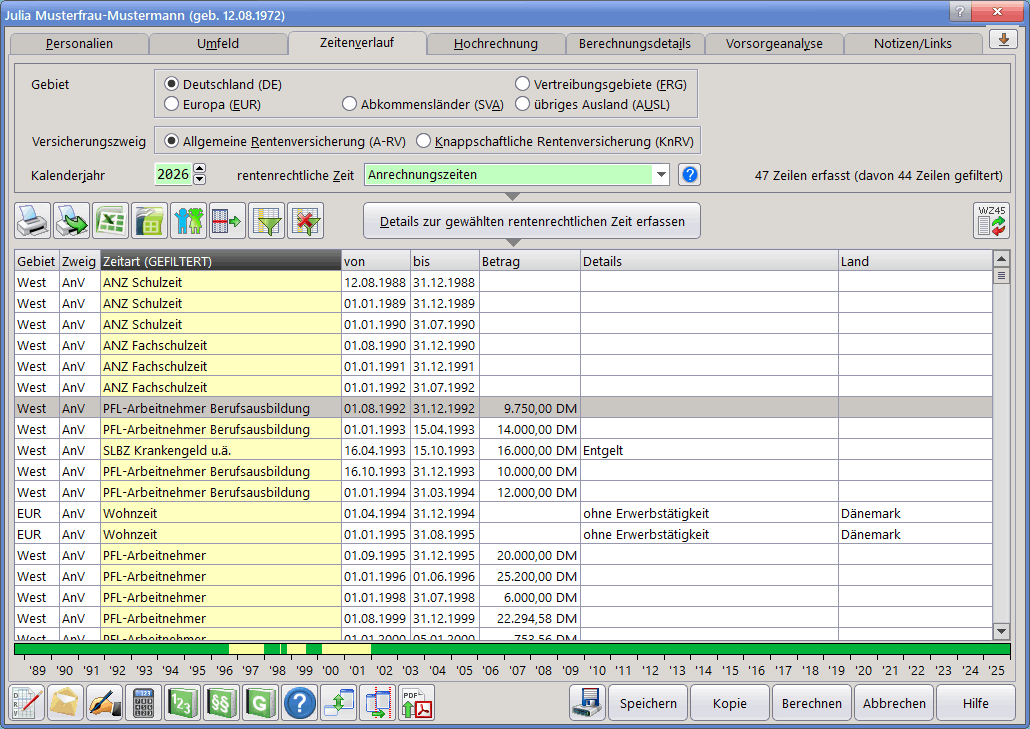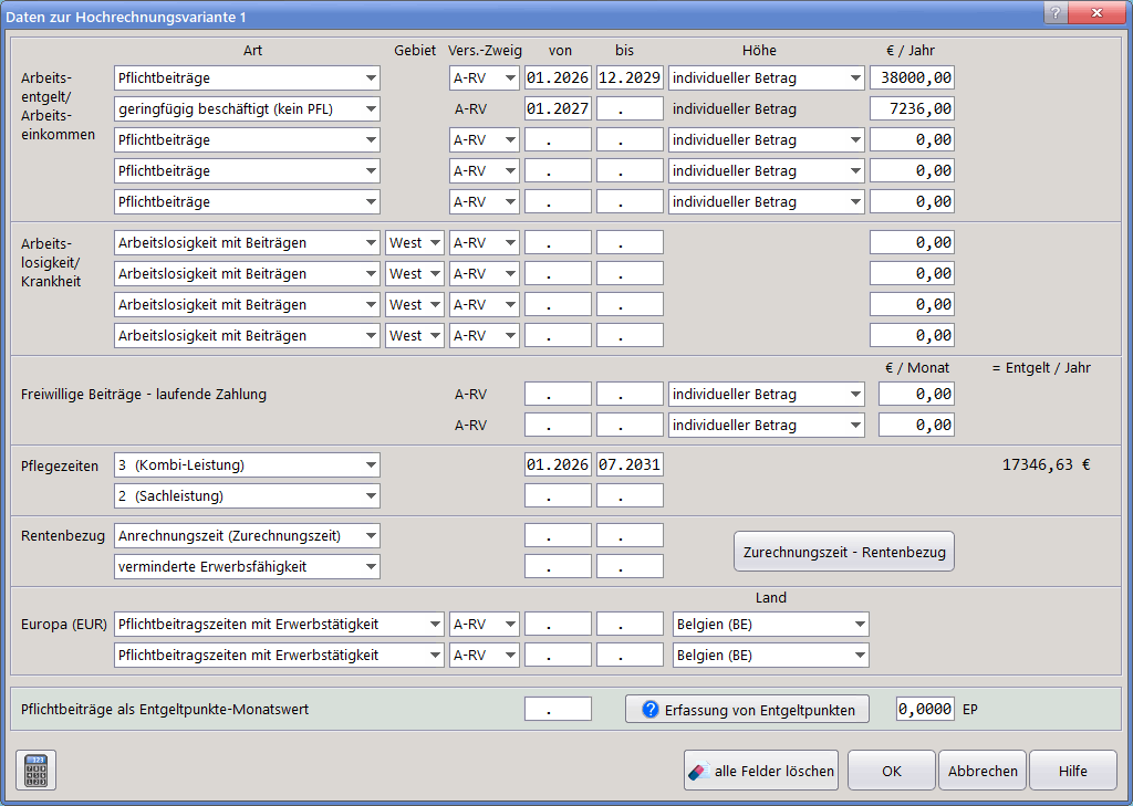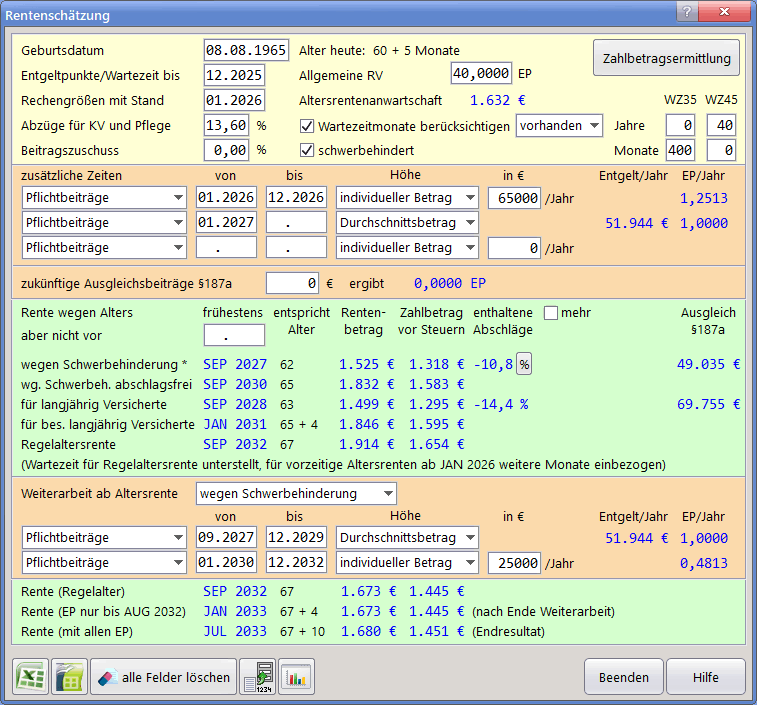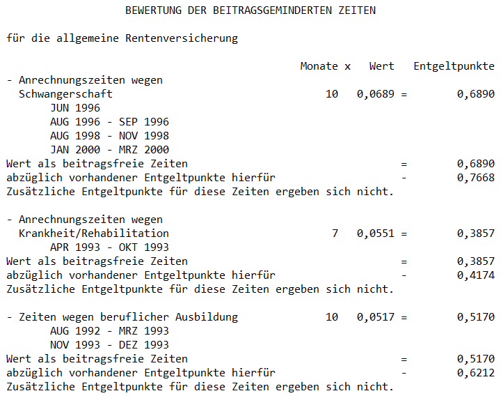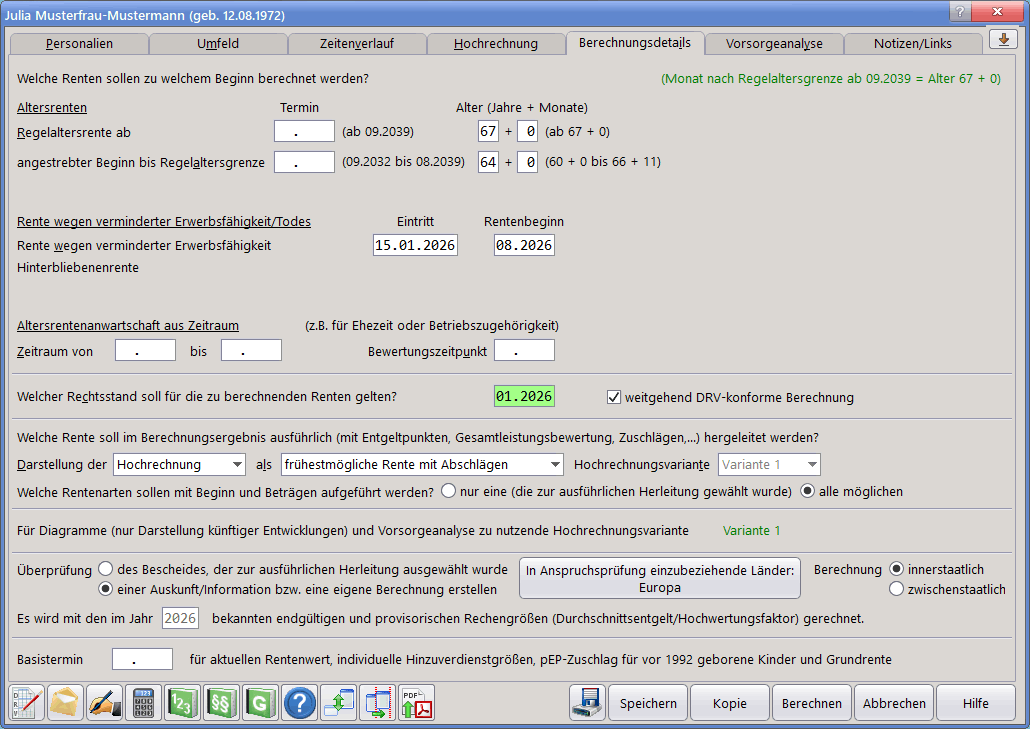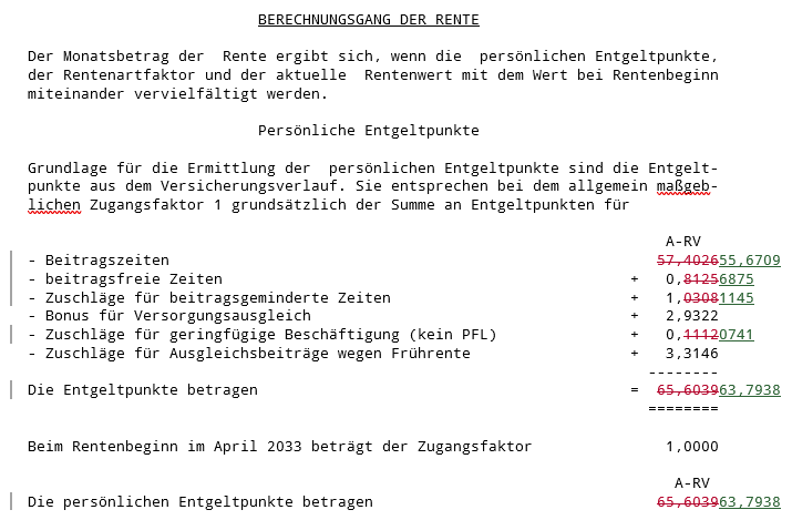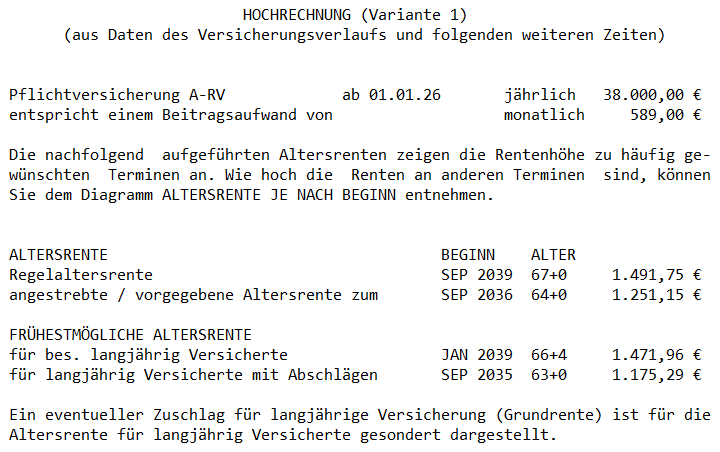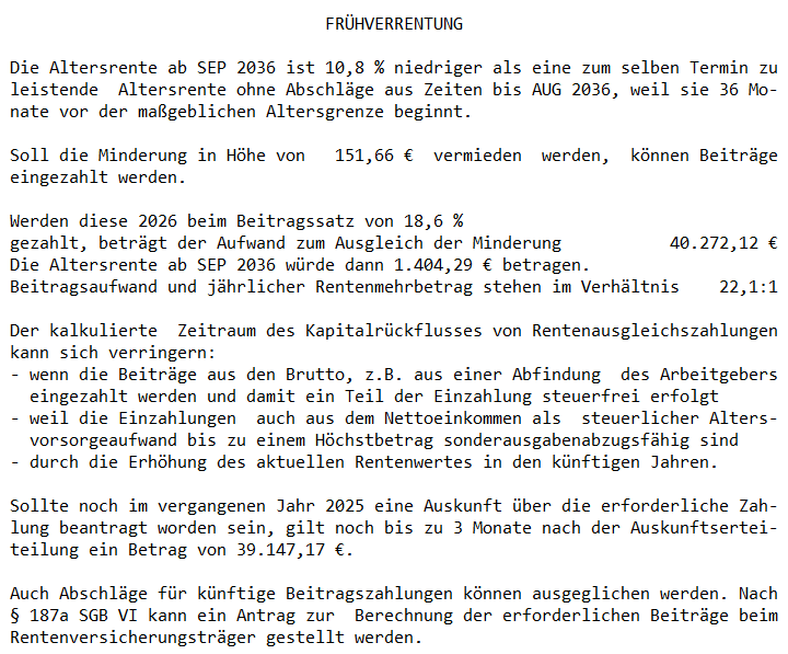 Ausgewählte Beispielabschitte: Grundberechung, Hochrechnung, Frühverrentung (Kosten für Ausgleichsbeiträge), Grundrentenzuschlag, beitragsgeminderte Zeiten, zwischenstaatliche Berechnung (pro rata), Diagramm zu möglichen Altersrenten, Beratungshinweis zu Mindestentgeltpunkten